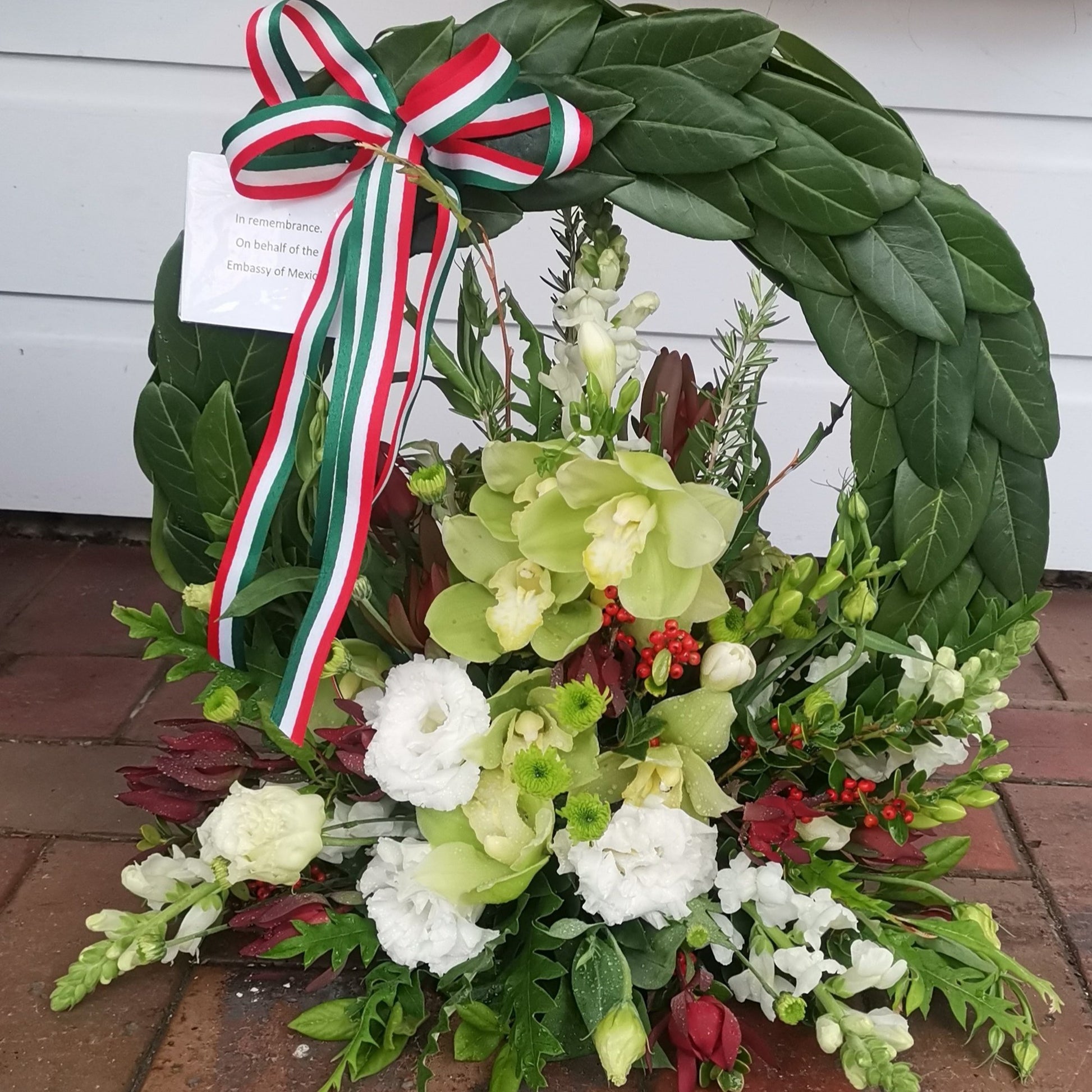 We create beautiful traditional ANZAC Day wreaths using laurel leaves with floral focals. We tailor make each wreath using different flowers and ribbons to suit your country's colours. Our standard wreaths are created on a 29cm base and meet the standards set by MFAT. 40cm also available