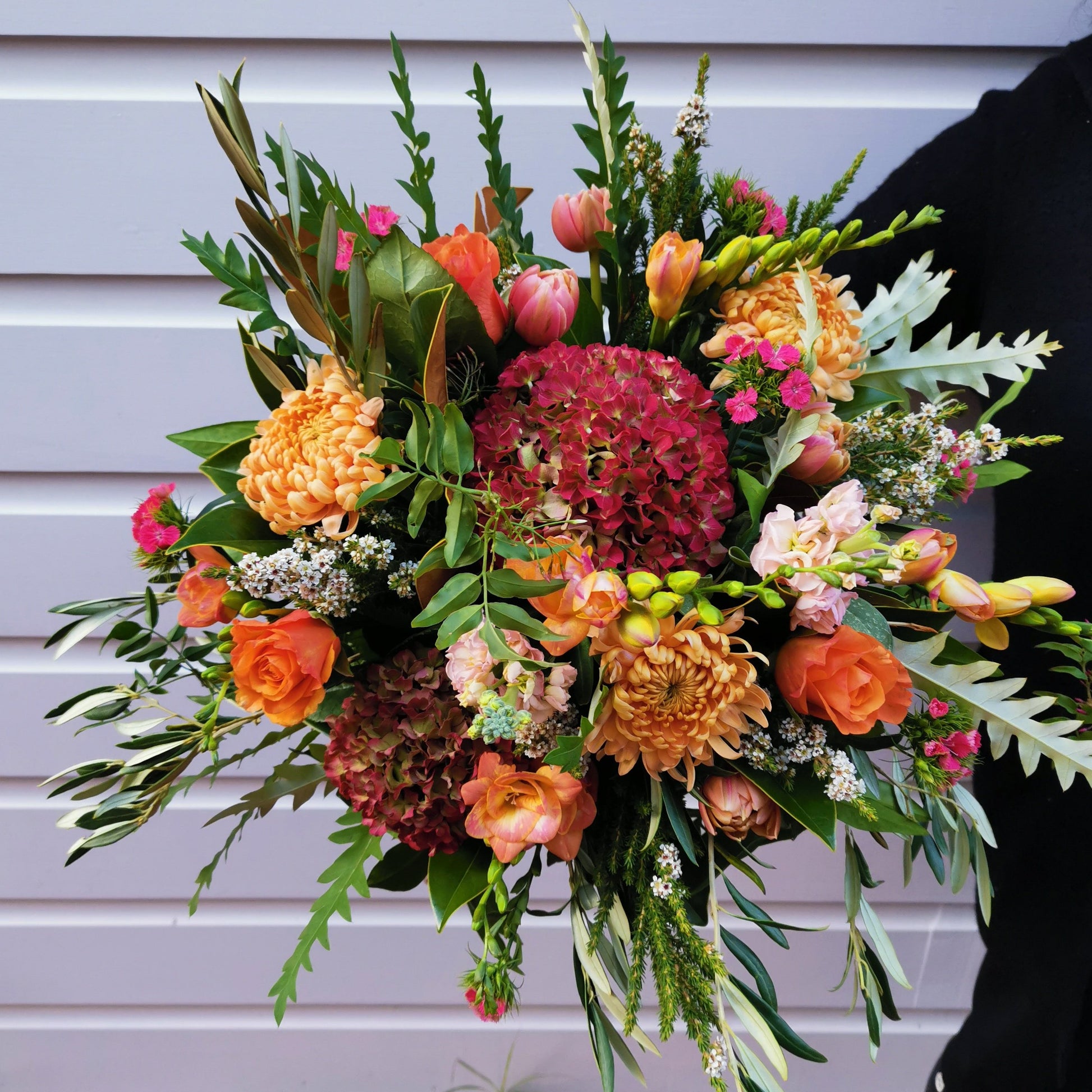 A fresh selection of flowers in the autumnal shades of reds and oranges arranged in a bouquet.