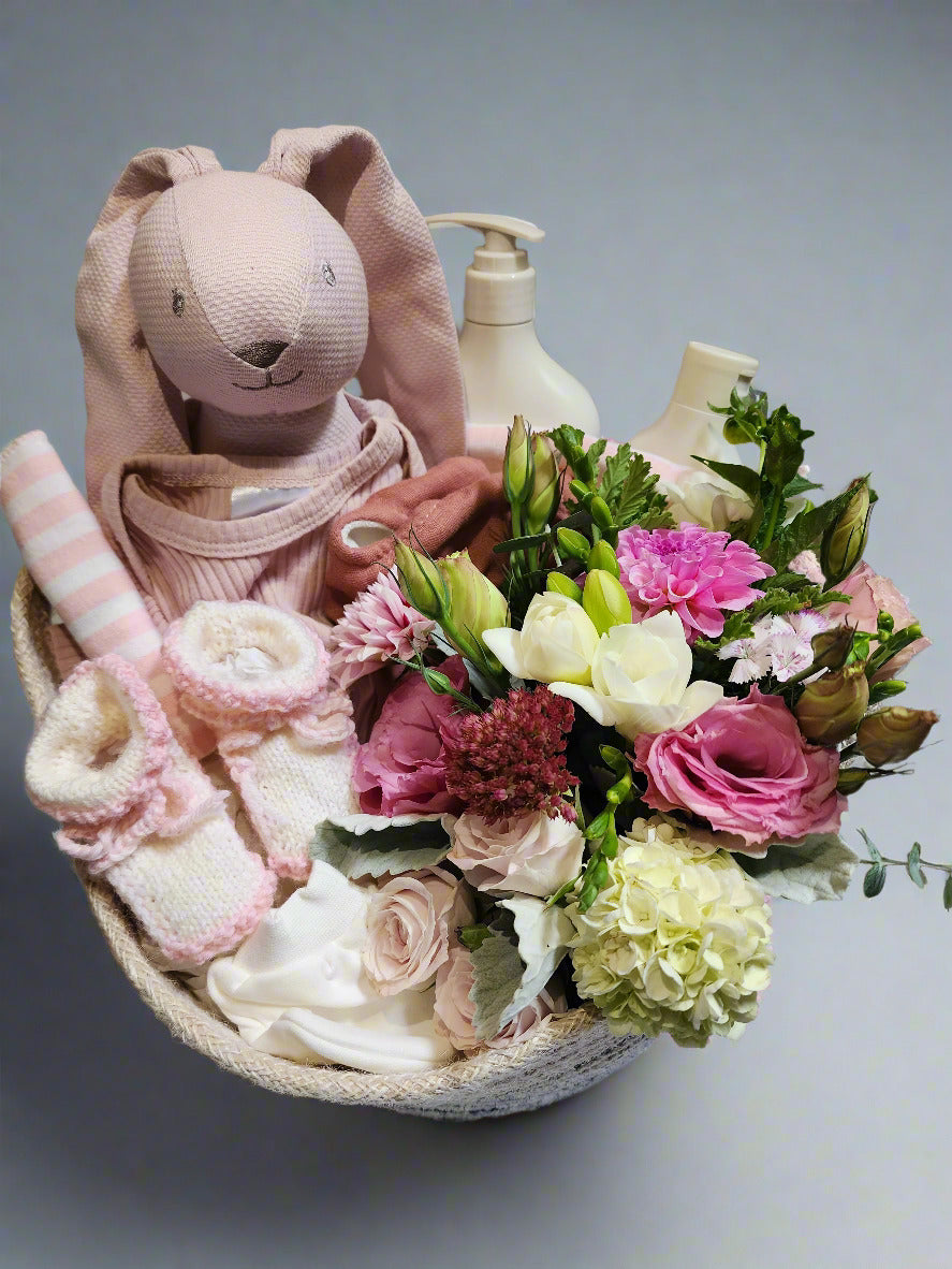 This baby basket contains a teddy bear, jumpsuit, bib, mittens, hand knitted woollen booties ,baby products and flowers for mum. Presented in a basket and finished off with a bow.