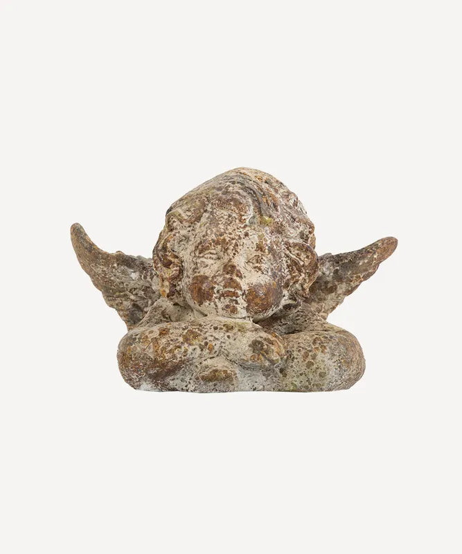 Suitable for indoors and outside. Antique distressed cream and brown finish. Resin. 38cmLx25cmWx22cmH