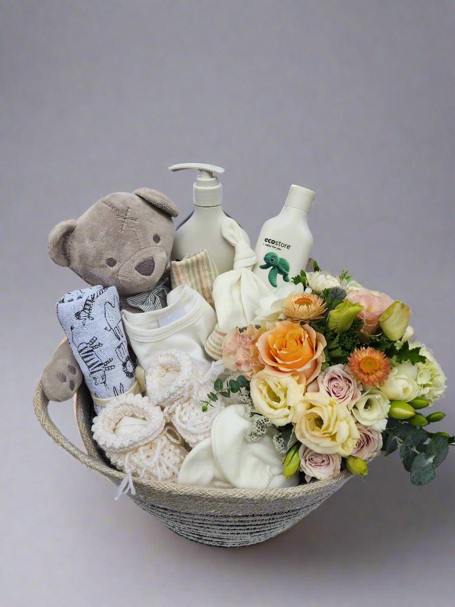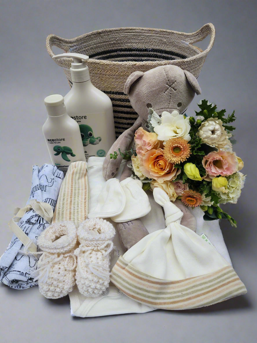 This baby basket contains a teddy bear, jumpsuit, bib, mittens, hand knitted woollen booties ,baby products and flowers for mum. Presented in a basket and finished off with a bow.